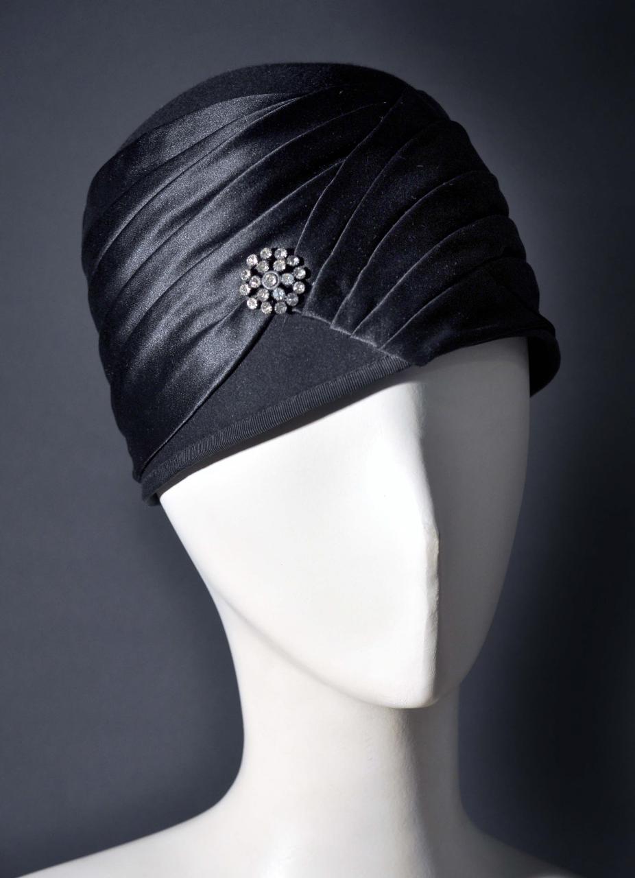 Cloche in feltro nero con alta fascia in raso di seta nera drappeggiata e fermata sul davanti da un «bottone» in galalite nera e strass; bordo in gros di seta nero.
