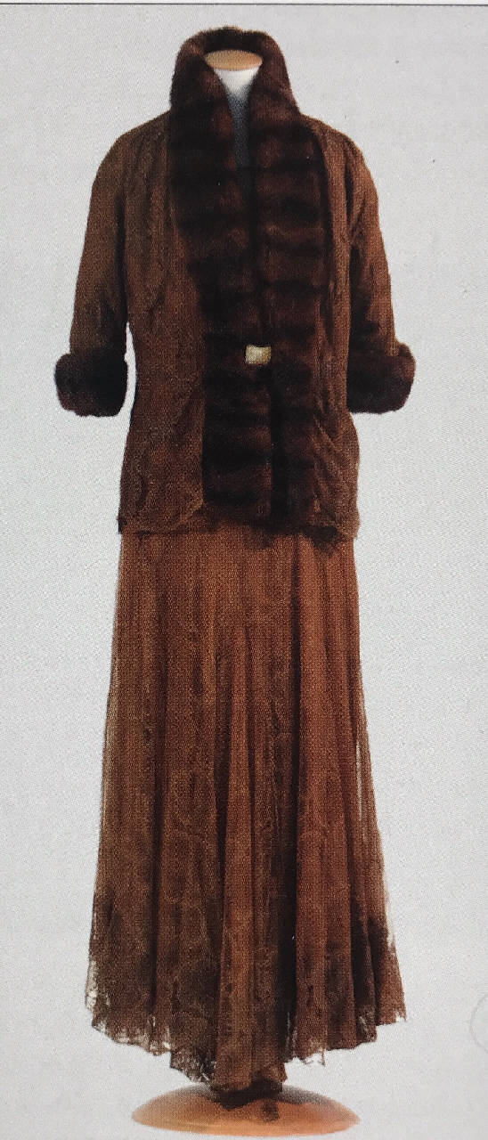 Abito femminile da sera in tre pezzi: sottoabito in crespo di seta marrone con spalline a sottoveste foderato in crespo di seta rosa cirpria; abito in tulle meccanico marrone chiaro ricamato a motivi floreali, maniche a tre quarti; giacca in crespo di seta e tulle profilata in pelliccia di visone con fibbia a fermaglio in madreperla.
