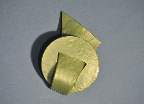 Fibbia a fermaglio da cintura, di forma composta. Corpo in galalite verde a imitazione giada, in due pezzi. Uno circolare con asola a traforo, l'altro a guisa di nastro passante. Passanti in metallo cromato.