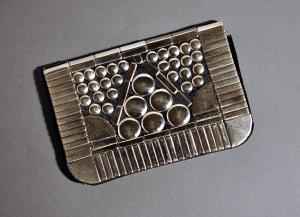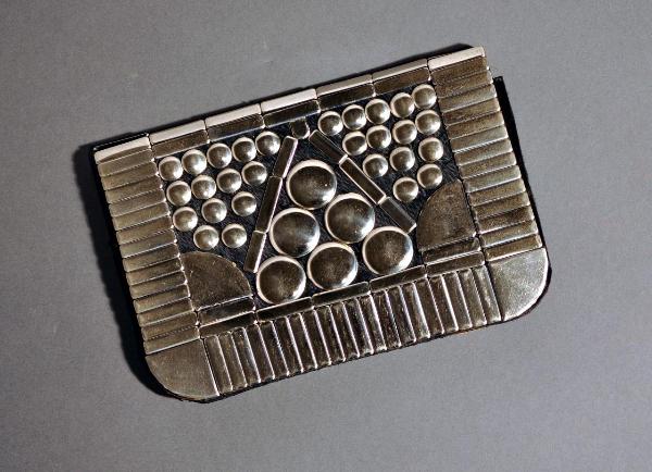 Borsa «a busta» da sera a placche e borchie metalliche lisce applicate a creare motivo decorativo geometrico su tela nera, incollata a sua volta su pelle nera.