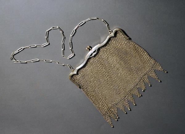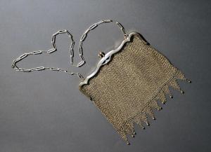Borsa da sera in maglia d'argento con bordo inferiore sagomato a losanghe decorate con piccole sfere d'argento. Cerniera in argento sagomata, chiusura a scatto. Manico a catenella in argento.