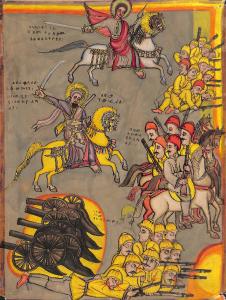 - NOTIZIE STORICO CRITICHE disegno a matita, acquerello, china su carta raffigurante probabilmente la battaglia di Adua tra l'esercito abissino e quello italiano del 1° marzo 1896 durante la guerra di Abissinia del 1895-96. Al centro, a grandi dimensioni, son oraffigurati san Giorgio a cavallo e Ras Maconnen i abiti tradizionali abissini. In basso a destra vi è un cumulo di soldati italiani morti durante la battaglia. A destra della composizione sono descritti soldati italian ia cavallo nell'atto di fuggire. L'esecuzioen dell'opera è probabilmente da attribuire a Aleca Enok, pittore di Ras Maconnen e databile al 28 ter 1897 del calendario etiopico che nel calendario giuliano corrisponde al 28 gennaio 1905.\nIl disegno è inchiodato con piccoli chiodi lungo i bordi su una tavola di compensato, sul retr odella quale è incollato un foglio a righecon la trascrizione in italiano di alcune iscrizioni in amarico presenti al recto del disegno.\nInsieme ad altri documenti, il disegno è stato registrato in ingresso nelle colleizoni museali il giorno 27/08/1937 quale dono del Dott. Colonnello Eliseo Mozzetti, con numero di carico 26127 e così descritto: "Due quadri abissini dipinti dal pittore Aleca Enok illustranti la guerra del 1896".
