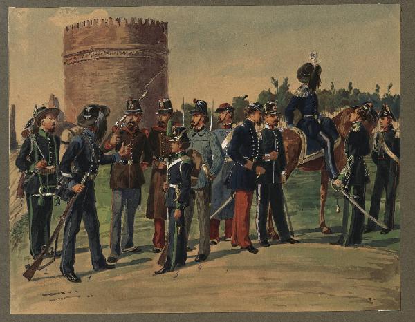 titolo proprio: Repubblica Romana 1848-49: 1. Battaglione bersaglieri Mellara sergente, 2.Bersaglieri Legione Romana tromba, 3.Battaglione della Speranza, 4.Battaglione volontari Lombardi, a cavallo ufficiale dei bersaglieri Mellara, ed altri