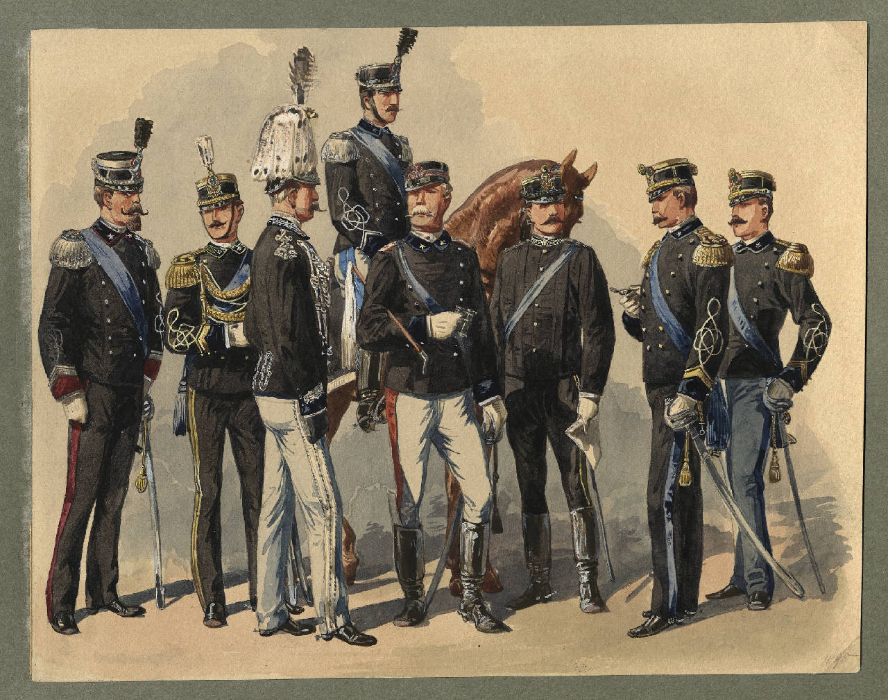 - NOTIZIE STORICO CRITICHE Nell'acquerello sono identificabili, da sinistra a destra, un maggiore in grande uniforme del Corpo Sanitario Militare, un maggiore del Corpo di Stato Maggiore in gran tenuta, un generale in grande uniforme, un tenente a cavallo in gran montura del Corpo Veterinario Militare, un tenente generale in uniforme di marcia, un capitano in uniforme di marcia del Corpo di Stato Maggiore, un maggiore in gran montura del Corpo Commissario Militare e un capitano in gran montura del Corpo Contabile.Militare,
