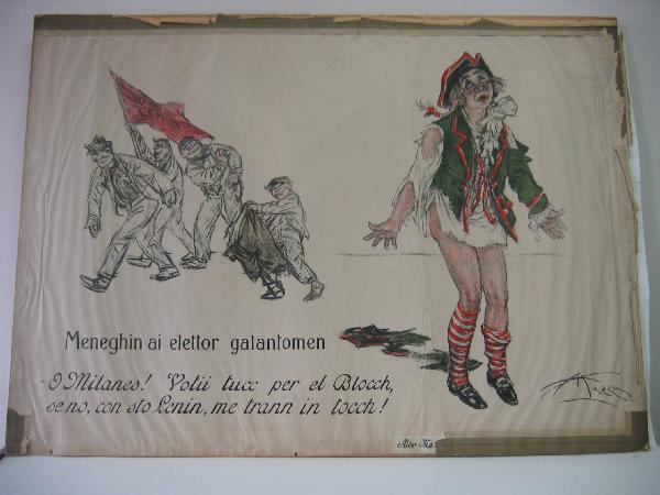 Meneghin ai elettor galantuomen./ O Milanes! Votii tuce per el blocc,/ se no, con sto Lenin, me tronn in tocc!