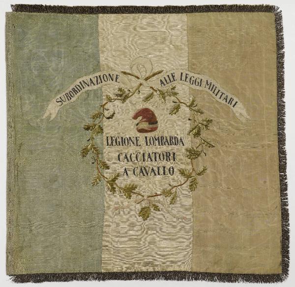 Stendardo realizzato in seta ricamata, privo di asta e arricchito da frange. Al recto, entro corona di foglie e bacche di quercia, è descritto il berretto frigio accompagnato dalla dicitura "LEGIONE LOMBARDA CACCIATORI A CAVALLO"; più in alto, è apposta la scritta "SUBORDINAZIONE ALLE LEGGI MILITARI". Al verso, sempre entro una corona di foglie e bacche di quercia, è descritto nuovamente il berretto frigio, accompagnato da una squadra con pendolo posta tra due pugnali di Bruto e Cassio; in alto, torva posto la dicitura "EGUAGLIANZA O MORTE".