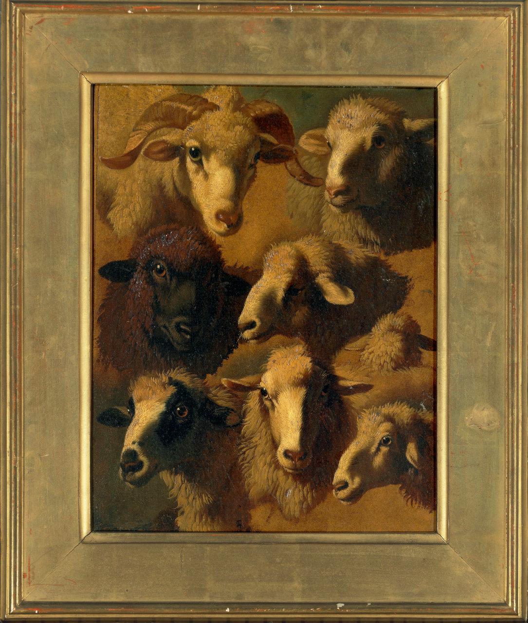 Studio di sei teste di pecore, una testa di montone e una testa di agnello. teste di pecore e montoni