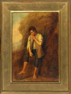 Studio di giovane contadino appoggiato ad un bastone. contadino in piedi appoggiato ad un bastone