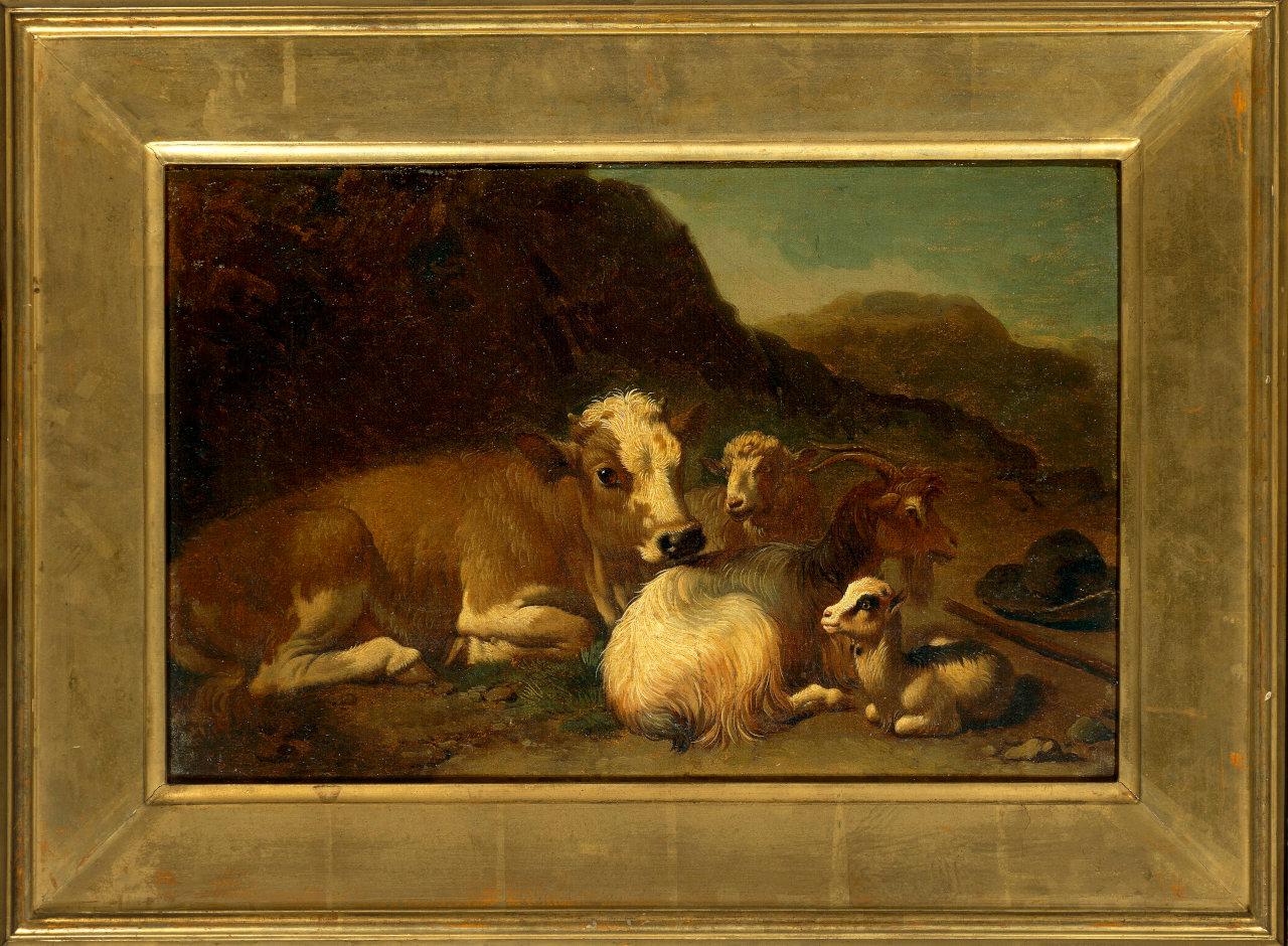 Studio di mucca, capre e pecora in riposo. mucca, capre e pecora in riposo