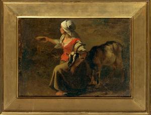 Studi di pastorella inginocchiata con ciotola di latte, capretta in piedi. pastorella con capretta