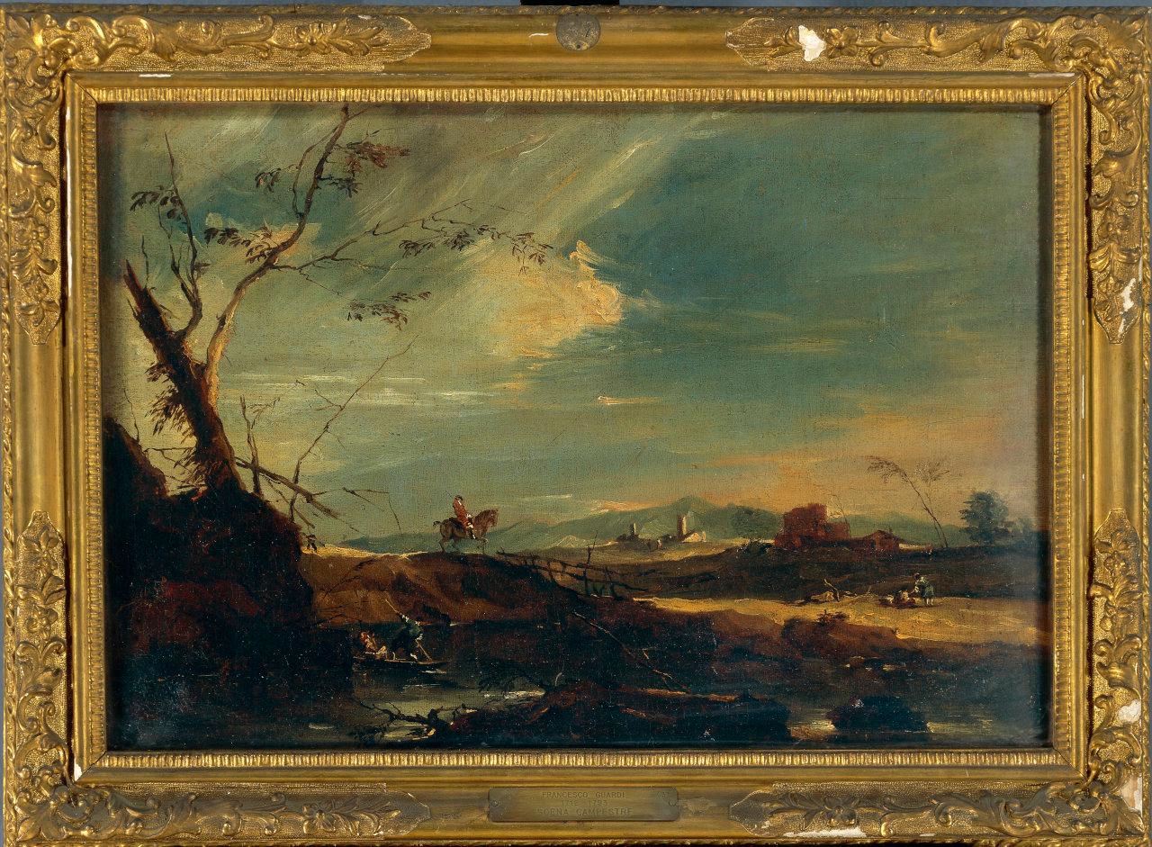 Paesaggio con cavaliere. pianoro con fiume e case