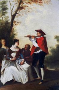 Nobildonna in giardino con suonatore di flauto. nobildonna in giardino e suonatore di flauto