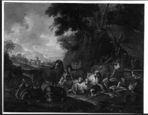PASTORI CON ANIMALI ACCANTO AD UNA CAPANNA