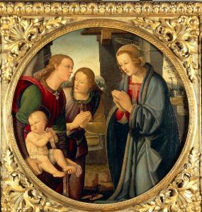 Maria e due angeli adorano il bambino. Sacra Conversazione