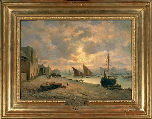 Il Tamigi con la veduta del Parlamento e parte della città di Londra. porto con barche