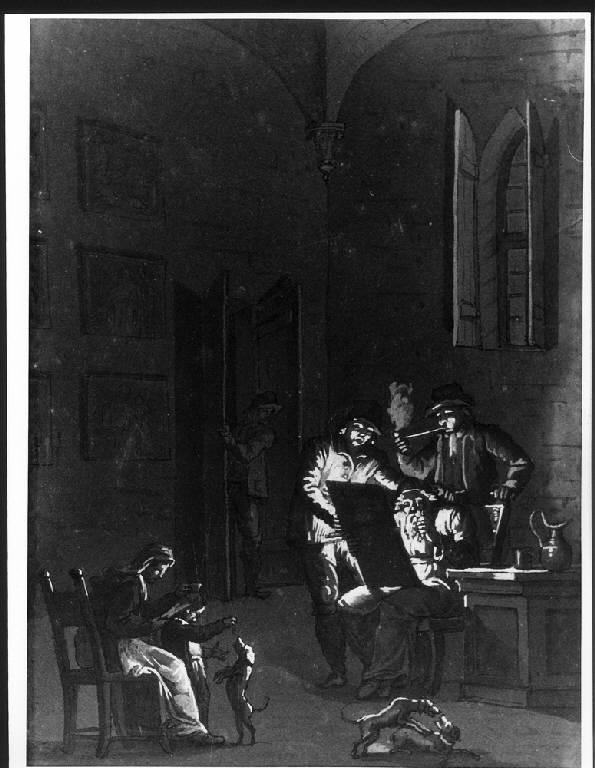 INTERNO CON DONNA, BAMBINO, CANE, FUMATORE DI PIPA E VECCHIO