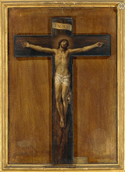 - NOTIZIE STORICO CRITICHE Il dipinto faceva parte della collezione del cardinale Cesare Monti, come documenta l'Inventario del 1638. A quell'epoca si trovava nella stanza da letto invernale del Cardinale ed aveva una cornice in ebano. Per disposizione testamentaria il crocifisso passa a Bartolomeo Fassio, arciprete del collegio di S. Tommaso; questo avviene presumibilmente nel 1650, anno della morte del cardinale. Non è invece documentata la data di ingresso dell'opera in Ambrosiana, dove è citata per la prima volta da Agostino Santagostino (1671, p. 71) nella Biblioteca; non se ne fa invece menzione nell'Inventario manoscritto del 1661. Si ritrova citata poi nell'opera del Bosca (1672, p. 128) e nell'Inventario manoscritto del 1685, quando è collocata nella Galleria delle Pitture, dove è ancora documentata nel 1798. Nel 1830 è invece documentata nella Sala del Cartone di Raffaello (Ms A. 357 Inf., fasc. 30, f. 118). In una guida dell'Ambrosiana del 1860 si dice che il Crocifisso, insieme all'acquasantiera in argento, si trovava sopra il letto del cardinal Federico Borromeo, ma questa notizia sembra poco probabile, appartenendo l'opera alla collezione Monti. È stato dimenticato dalla bibliografia cortonesca fino al catalogo ragionato del 1962 (Briganti 1962, p. 271); qui lo si ritiene opera tarda e probabilmente da mettere in relazione con il disegno per un crocefisso d'avorio promesso al Granduca di Toscana nel 1666 e inviato nel novembre di quell'anno a Firenze. Secondo Bona Castellotti (1980, p. 71) si tratta di una copia tarda. Strette sembrano invece le analogie stilistiche con il Cristo crocifisso dipinto ad affresco nella cappella di Palazzo Barberini a Roma (1631-1632), realizzato in un periodo non lontano dalla data in cui l'opera è sicuramente presente nella collezione Monti (1638), terminus ante quem per la sua esecuzione.