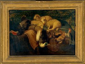 - NOTIZIE STORICO CRITICHE Il dipinto non è citato né da Ratti (1907), né da Galbiati (1951) né dalla Bohm (1934); nel 1934 si doveva presumibilmente trovare in deposito, perché la studiosa dice di non aver potuto catalogare le opere lì presenti. La tela è stata probabilmente concepita come bozzetto per una "Scena pastorale con famiglia di contadini che conduce animali da pascolo", (olio su tela, cm 190 x 280) venduto da Christie's a Roma il 16 maggio 1896 (Bona Castellotti 1986, fig. 395); due bozzetti analoghi sono stati segnalati dalla critica nelle versioni autografe, eseguite con varianti, di Brera (olio su carta, cm 30 x 44; Pinacoteca di Brera 1989, p. 298, fig. 209) e in collezione privata (Bona Castellotti 1986, fig. 403). La tela dell'Ambrosiana è più completa e meglio definita delle due opere citate, e si presenta come terzo bozzetto per la medesima opera.