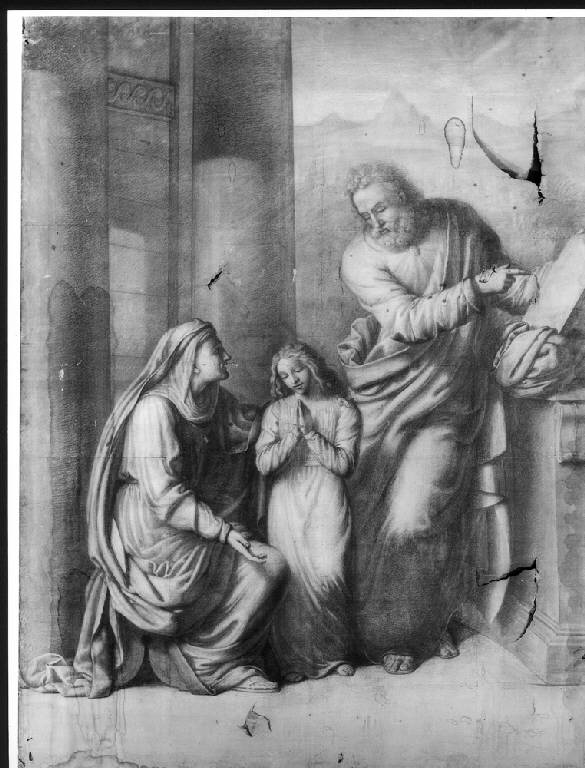 - NOTIZIE STORICO CRITICHE Non si conosce la provenienza del cartone nè il momento in cui è entrato in Ambrosiana. Secondo il Galbiati, che non specifica la datazione del cartone, si tratta di Cristo fanciullo tra San Giuseppe al lavoro e la Madre.
