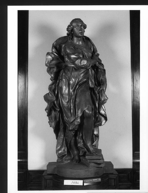 - NOTIZIE STORICO CRITICHE Le sette statue raffiguranti le Arti Liberali vennero commissionate a Dionigi Bussola il 17 maggio 1670, anno in cui fu chiamato presso l'Accademia Ambrosiana come professore di scultura. La loro stima fu eseguita nel 1673. Si trovavano inizialmente all'interno di nicchie nei lati meridionale e settentrionale (Latuada 1738, p. 105) del cortile porticato che nel 1823 venne coperto per essere provvisariamente utilizzato come Sala di Lettura, in attesa della realizzazione della nuova sala, l'attuale Sala Pio XI, completata nel 1923. Nel 1836 furono collocate sulla terrazza davanti al nuovo ingresso; da qui furono spostate nel 1923, per essere ricollocate nella nuova sala di lettura. In origine le otto statue erano poste su piedistalli in pietra d'Angera, donati dal conte Antonio Borromeo; erano diversi tra loro ed ornati da drappi e festoni; da alcune raffigurazioni (L'Ambrosiana 1923) sembra di distinguere anche le iscrizioni che identificavano le singole allegorie. Con il trasferimento nell'attuale Sala di lettura, l'architetto Annoni sostituì i piedistalli originali con altri in legno e collocò le statue davanti a colonne di marmo tigrato. In cima erano incisi i nomi delle singole Scienze, eliminati con il successivo restauro (1990-1997) della Sala di lettura. E' quindi oggi meno facile identificare le diverse allegorie. Le otto statue sono in terracotta; nel 1747 il doratore Caccia fu incaricato di dipingerli con una vernice bianca con finimenti dorati. Nel 1923 l'architetto Annoni le fece ricoprire di una lamina dorata. Nel corso di un successivo intervento, avvenuto nel 1965-66 ad opera dell'architetto Luigi Caccia Dominioni, le statue furono rivestite di uno strato di idropittura di un colore simile a quello della terracotta, nella volontà di riportarle ad una cromia simile a quella originale. Nel corso dell'ultimo intervento (1992-93) questa ridipintura è stata eliminata, mentre si è deciso di mantenere la doratura dell'intervento dell'Annoni. \nDal punto di vista stilistico, la critica ritiene che le otto statue sino statue realizzate all'interno dell'attività accademica del Bussola, e probabilmente come dimostrazione didattica per gli allievi. Questo spiegherebbe il livello qualitativo non eccelso delle opere e la minore dimestichezza da parte dell'artista nella lavorazione della terracotta (a detta del restauratore è in alcuni punti malcotta o addirittura cruda; vi sono inoltre parti bruciate e cavità).