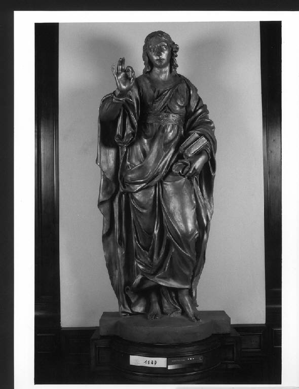 - NOTIZIE STORICO CRITICHE Le sette statue raffiguranti le Arti Liberali vennero commissionate a Dionigi Bussola il 17 maggio 1670, anno in cui fu chiamato presso l'Accademia Ambrosiana come professore di scultura. La loro stima fu eseguita nel 1673. Si trovavano inizialmente all'interno di nicchie nei lati meridionale e settentrionale (Latuada 1738, p. 105) del cortile porticato che nel 1823 venne coperto per essere provvisariamente utilizzato come Sala di Lettura, in attesa della realizzazione della nuova sala, l'attuale Sala Pio XI, completata nel 1923. Nel 1836 furono collocate sulla terrazza davanti al nuovo ingresso; da qui furono spostate nel 1923, per essere ricollocate nella nuova sala di lettura. In origine le otto statue erano poste su piedistalli in pietra d'Angera, donati dal conte Antonio Borromeo; erano diversi tra loro ed ornati da drappi e festoni; da alcune raffigurazioni (L'Ambrosiana 1923) sembra di distinguere anche le iscrizioni che identificavano le singole allegorie. Con il trasferimento nell'attuale Sala di lettura, l'architetto Annoni sostituì i piedistalli originali con altri in legno e collocò le statue davanti a colonne di marmo tigrato. In cima erano incisi i nomi delle singole Scienze, eliminati con il successivo restauro (1990-1997) della Sala di lettura. E' quindi oggi meno facile identificare le diverse allegorie. Le otto statue sono in terracotta; nel 1747 il doratore Caccia fu incaricato di dipingerli con una vernice bianca con finimenti dorati. Nel 1923 l'architetto Annoni le fece ricoprire di una lamina dorata. Nel corso di un successivo intervento, avvenuto nel 1965-66 ad opera dell'architetto Luigi Caccia Dominioni, le statue furono rivestite di uno strato di idropittura di un colore simile a quello della terracotta, nella volontà di riportarle ad una cromia simile a quella originale. Nel corso dell'ultimo intervento (1992-93) questa ridipintura è stata eliminata, mentre si è deciso di mantenere la doratura dell'intervento dell'Annoni. \nDal punto di vista stilistico, la critica ritiene che le otto statue sino statue realizzate all'interno dell'attività accademica del Bussola, e probabilmente come dimostrazione didattica per gli allievi. Questo spiegherebbe il livello qualitativo non eccelso delle opere e la minore dimestichezza da parte dell'artista nella alvorazione della terracotta (a detta del restauratore è in alcuni punti malcotta o addirittura cruda; vi sono inoltre parti bruciate e cavità).