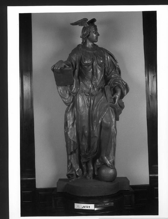 - NOTIZIE STORICO CRITICHE Le sette statue raffiguranti le Arti Liberali vennero commissionate a Dionigi Bussola il 17 maggio 1670, anno in cui fu chiamato presso l'Accademia Ambrosiana come professore di scultura. La loro stima fu eseguita nel 1673. Si trovavano inizialmente all'interno di nicchie nei lati meridionale e settentrionale (Latuada 1738, p. 105) del cortile porticato che nel 1823 venne coperto per essere provvisariamente utilizzato come Sala di Lettura, in attesa della realizzazione della nuova sala, l'attuale Sala Pio XI, completata nel 1923. Nel 1836 furono collocate sulla terrazza davanti al nuovo ingresso; da qui furono spostate nel 1923, per essere ricollocate nella nuova sala di lettura. In origine le otto statue erano poste su piedistalli in pietra d'Angera, donati dal conte Antonio Borromeo; erano diversi tra loro ed ornati da drappi e festoni; da alcune raffigurazioni (L'Ambrosiana 1923) sembra di distinguere anche le iscrizioni che identificavano le singole allegorie. Con il trasferimento nell'attuale Sala di lettura, l'architetto Annoni sostituì i piedistalli originali con altri in legno e collocò le statue davanti a colonne di marmo tigrato. In cima erano incisi i nomi delle singole Scienze, eliminati con il successivo restauro (1990-1997) della Sala di lettura. E' quindi oggi meno facile identificare le diverse allegorie. Le otto statue sono in terracotta; nel 1747 il doratore Caccia fu incaricato di dipingerli con una vernice bianca con finimenti dorati. Nel 1923 l'architetto Annoni le fece ricoprire di una lamina dorata. Nel corso di un successivo intervento, avvenuto nel 1965-66 ad opera dell'architetto Luigi Caccia Dominioni, le statue furono rivestite di uno strato di idropittura di un colore simile a quello della terracotta, nella volontà di riportarle ad una cromia simile a quella originale. Nel corso dell'ultimo intervento (1992-93) questa ridipintura è stata eliminata, mentre si è deciso di mantenere la doratura dell'intervento dell'Annoni. \nDal punto di vista stilistico, la critica ritiene che le otto statue sino statue realizzate all'interno dell'attività accademica del Bussola, e probabilmente come dimostrazione didattica per gli allievi. Questo spiegherebbe il livello qualitativo non eccelso delle opere e la minore dimestichezza da parte dell'artista nella alvorazione della terracotta (a detta del restauratore è in alcuni punti malcotta o addirittura cruda; vi sono inoltre parti bruciate e cavità).