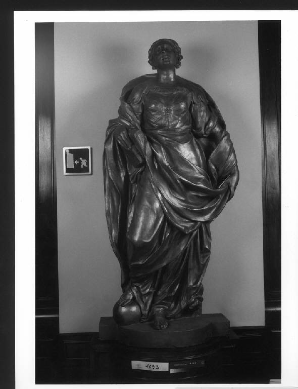 - NOTIZIE STORICO CRITICHE Le sette statue raffiguranti le Arti Liberali vennero commissionate a Dionigi Bussola il 17 maggio 1670, anno in cui fu chiamato presso l'Accademia Ambrosiana come professore di scultura. La loro stima fu eseguita nel 1673. Si trovavano inizialmente all'interno di nicchie nei lati meridionale e settentrionale (Latuada 1738, p. 105) del cortile porticato che nel 1823 venne coperto per essere provvisariamente utilizzato come Sala di Lettura, in attesa della realizzazione della nuova sala, l'attuale Sala Pio XI, completata nel 1923. Nel 1836 furono collocate sulla terrazza davanti al nuovo ingresso; da qui furono spostate nel 1923, per essere ricollocate nella nuova sala di lettura. In origine le otto statue erano poste su piedistalli in pietra d'Angera, donati dal conte Antonio Borromeo; erano diversi tra loro ed ornati da drappi e festoni; da alcune raffigurazioni (L'Ambrosiana 1923) sembra di distinguere anche le iscrizioni che identificavano le singole allegorie. Con il trasferimento nell'attuale Sala di lettura, l'architetto Annoni sostituì i piedistalli originali con altri in legno e collocò le statue davanti a colonne di marmo tigrato. In cima erano incisi i nomi delle singole Scienze, eliminati con il successivo restauro (1990-1997) della Sala di lettura. E' quindi oggi meno facile identificare le diverse allegorie. Le otto statue sono in terracotta; nel 1747 il doratore Caccia fu incaricato di dipingerli con una vernice bianca con finimenti dorati. Nel 1923 l'architetto Annoni le fece ricoprire di una lamina dorata. Nel corso di un successivo intervento, avvenuto nel 1965-66 ad opera dell'architetto Luigi Caccia Dominioni, le statue furono rivestite di uno strato di idropittura di un colore simile a quello della terracotta, nella volontà di riportarle ad una cromia simile a quella originale. Nel corso dell'ultimo intervento (1992-93) questa ridipintura è stata eliminata, mentre si è deciso di mantenere la doratura dell'intervento dell'Annoni. \nDal punto di vista stilistico, la critica ritiene che le otto statue sino statue realizzate all'interno dell'attività accademica del Bussola, e probabilmente come dimostrazione didattica per gli allievi. Questo spiegherebbe il livello qualitativo non eccelso delle opere e la minore dimestichezza da parte dell'artista nella lavorazione della terracotta (a detta del restauratore è in alcuni punti malcotta o addirittura cruda; vi sono inoltre parti bruciate e cavità).