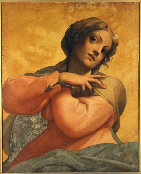 - NOTIZIE STORICO CRITICHE Si tratta di una copia fedele, anche se indurita nei tratti, di un particolare (busto della Vergine) dell'affresco del Correggio del catino absidale della chiesa di San Giovanni Evangelista di Parma, raffigurante l'Incoronazione della Vergine. La copia fu ordinata dal Cardinale Federico Borromeo ed è citata a partire dalle disposizioni del 1607 (codice Ambr.Ms.SP.II.262. n.5). Nell'atto di donazione del 1618 si dice: "Una Madonna con le mani in croce in atto di esser coronata, dal mezzo in su più grande del naturale copiata dal Caracciolo Bolognese, da quella del Correggio, che già si vedeva in Parma in una Tribuna, alta tre braccia e larga due e mezzo, senza cornici". L'affresco originale del Correggio era già stato staccato prima del crollo nella chiesa di Parma nel 1587 (ora è conservato presso la Galleria Nazionale della stessa città) e ne era stata fatta una copia anche dal bolognese Cesare Aretusi. Il Borromeo, che nel "Musaeum" lamenterà le precarie condizioni degli affreschi correggeschi, deve aver fatto eseguire la copia dopo il suo arrivo a Milano nel 1601. Malvasia disse che Annibale Carracci e forse anche Agostino fecero delle copie dell'affresco e secondo Coope (1977) una di queste venne ordinata dal Borromeo. È probabile che si tratti di Agostino Carracci, presente a Parma presso la corte Farnese tra il 1600 ed il 1602, anno della sua morte. Forse il Cardinale trattò con i Farnese per avere una copia dell'affresco, come farà nel 1610 per la Madonna detta "Zingarella", sempre del Correggio, copiata da Bartolomeo Schedoni, anch'egli operante presso i Farnese. In base a quest'ultimo dato, la Jones (1993) non esclude che Schedoni sia l'autore anche della copia della Madonna Incoronata. Nell'inventario della Pinacoteca del 1661 (fasc. 25 nel Ms A 357 inf., "Inventario di quanto si trova nel salone della veneranda bibl.Ambrosiana di Milano, et altri luoghi della med.a", p. 76) è segnalato " a mano diritta dell'ingresso una imagine della B. Vergine con le bracia incrocciate su il petto, tutti con le rigole d'oro, nella facciata che si mira entrando nel Salone". Nell'inventario del 1685 (S.Q. + II.35) l'opera è citata come "Assunta", sempre copia di Carracci dal Correggio, esposta nella Galleria delle sculture, ora incorniciata di "rigole d'oro". Nello stesso codice vi è un fascicolo del 1798, che completa l'inventario precedente, in cui è segnalata "l'Assunta in mezza vita di statura gigantesca, copia di Caracciolo da altra del Correggio, alto b 2 e mezzo e largo b 2, cornice a rigole d'oro" (p.83). Nella guida di Veneziani del 1860 risulta ancora esposta con la stessa attribuzione, mentre non compare più nelle guide del Ratti (1907) e del Galbiati (1951). Nell'inventario Nurchi (1984) non si trova alcuna attribuzione.