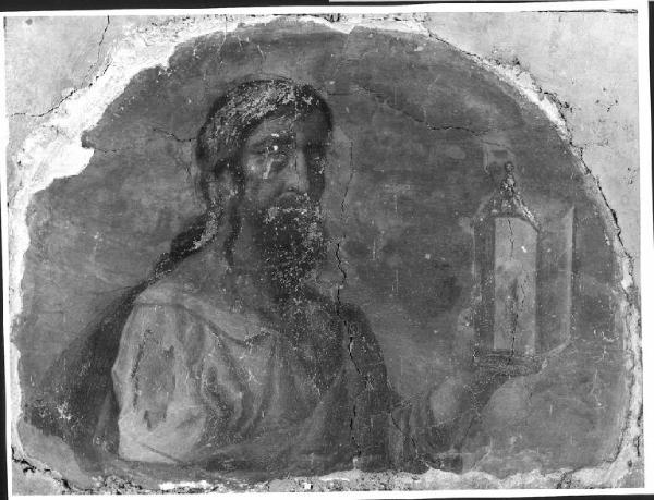 La lunetta ad affresco è incassata in un blocco di cemento rettangolare, incorniciato in legno.
