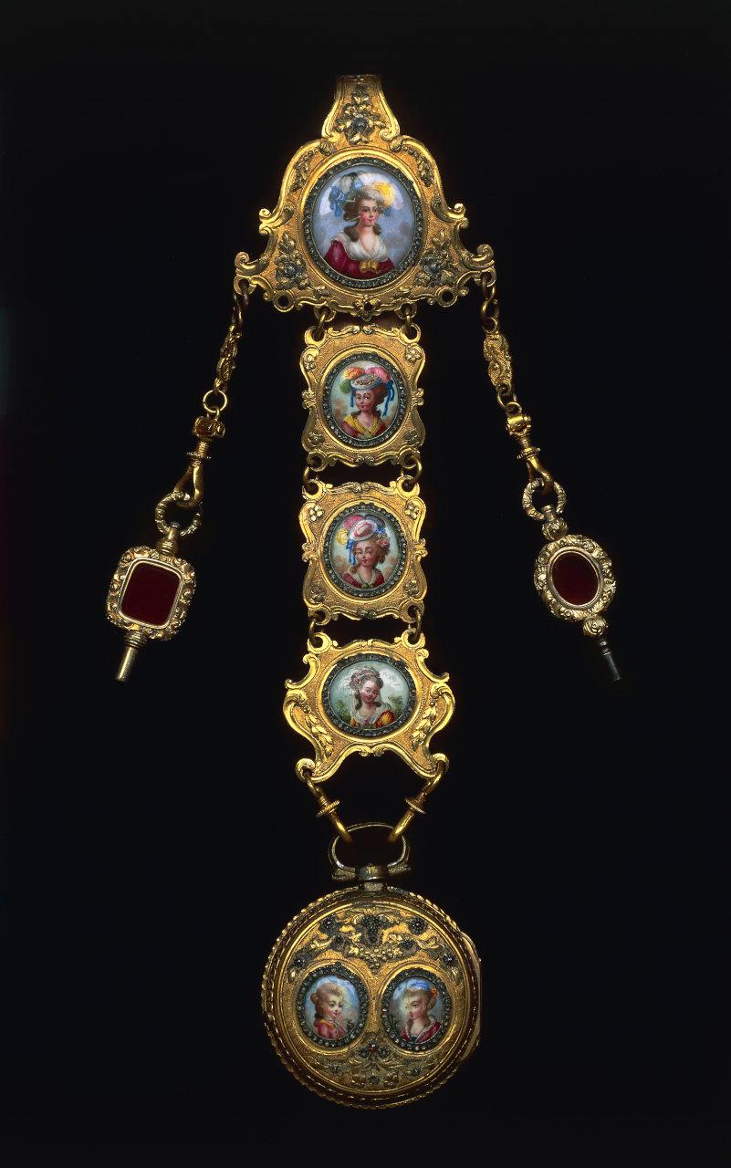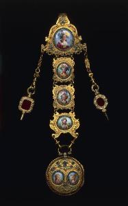 L'orologio è tondo, decorato con motivi a tralce di vite e con due ritrattini ovali con un fanciullo e una damina. È appeso a un pendente composto da tre piastre (ciascuna con un ritratto di dama), che parte da una fibbia sagomata con un ritratto femminile ovale di dimensioni maggiori. Alla fibbia sono agganciati due pendenti con le chiavette di regolazione, che hanno l'impugnatura in pietra dura.