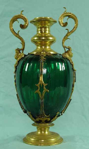 - NOTIZIE STORICO CRITICHE Il nostro vaso appartiene ad un gruppo di vetri, tra i quali figurano anche delle coppe ovali sagomate, in vetro acquamarina, sempre con montature in bronzo dorato, conservati nella collezione James Rotschild di Waddeson Manor e nella Galleria Regionale di Palazzo Abatellis a Palermo (CHARLESTON 1977, pp.128-129; BAROVIER MENTASTI 2001, pp. 252-253). Sono generalmente attribuiti alle vetrerie medicee di Firenze e di Pisa. Vetrerie volute dalla signoria medicea con il contributo fondamentale di alcuni maestri vetrai muranesi, chiamati a Firenze e ivi giunti a partire dal 1570 con Bortolo d'Alvise e più tardi, intorno al 1618 con Giacomo Luna. Il maestro muranese è chiamato da Cosimo II, che incarica Jacopo Ligozzi di disegnare alcuni vetri per le sua fornace, alcuni con montature in metallo come documentato da alcuni suoi disegni e da un dipinto, Fortuna, conservati agli Uffizi (ZECCHIN 1987, pp.131-147; HEIKAMP 1986, p.90, figg.74-75; p.137, fig.122; pp.275-276). Questi vasi colorati, di solito in vetro verde o azzurro, montati con fasce "in rame indorato", non sono per ora documentati nelle collezioni fiorentine ma sono citati nell'inventario del 1619 di Cosimo II , in quello del Granduca Ferdinando Secondo e nell'inventario dei mobili e masserizie del Principe Cardinale Leopoldo di Toscana del 1678 con la dicitura "vasi in vetro verde con manichi di rame dorato", taluni in forma di "serpe" (HEIKAMP 1986, p.272, p.370, pp.382-383).\nLa produzione di questo tipo particolare di manufatti vitrei si colloca tra la fine del Cinquecento fino ai primi decenni del Seicento. La loro datazione potrebbe essere spostata fino alla prima metà del XVII secolo, poiché in un dipinto di Giovanni Benedetto Castiglione, detto il Grechetto, Circe (fig. ), conservato agli Uffizi, datato intorno al sesto-settimo decennio del Seicento, è raffigurata una coppa ovale sagomata in vetro acquamarina con una montatura in rame dorato, molto simile agli esemplari di Waddeson Manor e di Palermo (La natura morta¿ 2003, pp. 320-321). La datazione del dipinto costituisce un'utile indicazione cronologica ante quem per la produzione di questi vetri. \nIl gusto che caratterizza questi oggetti vitrei è avvicinabile ai vasi di più piccole dimensioni in pietre dure e metalli, che nello stesso periodo uscivano dal laboratorio delle pietre dure di Firenze (BAROVIER MENTASTI 2001, pp. 252-253). Vasi analoghi sono disegnati nella Bichierografia (1604) di Giovanni Maggi, dedicata al cardinal Del Monte, che intratteneva stretti rapporti con i Medici (ZECCHIN 1987, p.149) .\nI vasi più simili al nostro pezzo, non solo per la parte in vetro verde, ma anche per il tipo di montatura in rame dorato, sono conservati nelle Civiche Raccolte d'Arte Applicata del Castello Sforzesco di Milano (MORI 1996, p.78).\nAltri pezzi in vetro verde, incolore e acquamarina, con differenti tipologie di montature in bronzo appartengono a diverse collezioni pubbliche: al Museo Poldi Pezzoli di Milano (MARIACHER, ROFFIA 1983, p.238, n. 98); alle Civiche Raccolte d'Arte Applicata di Milano (MORI 1996, p.77); all'Istituto di Archeologia dell'Università di Catania (ZECCHIN 1987, p.149); alla collezione James Rotschild di Waddeson Manor (CHARLESTON 1977, pp.138-139); al British Museum di Londra (TAIT 1979, pp.111, n. 183); alle Kunstsammlungen der Veste Coburg (THEUERKAUFF LIEDERWALD 1994, ); al Museo Civico di Torino (MALLÉ 1971, n.68).\nIl nostro pezzo è citato nell'Atto di Donazione del 1937 al n. 1 della sezione oreficerie: " Due vasi in vetro verde montate in bronzo dorato, lavoro di oreficeria romana dei primi del sec.XVII appartenente all'arredo d'altare di Papa (Borghese).