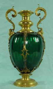 Vaso di forma ovoidale con costolature ad andamento verticale ottenute con la soffiatura a stampo. Le costolature sono poco a rilievo. Poggia su di un piede circolare in bronzo dorato che è saldato sui quattro lati, con fasce traforate e cesellate. Due delle fasce si concludono con due ansette. Corto collo anch'esso lavorato in metallo dorato con rigonfiamento anulare
