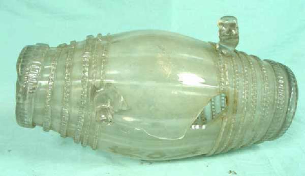Bottiglia a forma di botticella percorsa da costolature ad andamento orizzontale ottenute con la soffiatura a stampo; incisa a rotina con motivi floreali. Diversi fili incolori, lavorati con le pinze, sono avvolti alle due estremità del corpo.Quattro piedini a ricciolo, ne sono rimasti solo due. Imboccatura a rilievo, mancante di un pezzo con bordo spesso e svasato. Doppio segno del pontello alle due estremità circolari