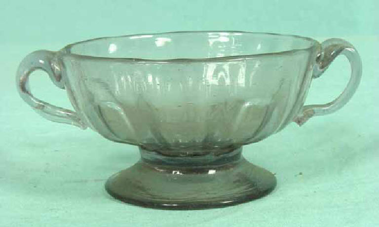 Coppetta biansata su piede circolare in vetro pieno. Decorata da bacellature nella parte inferiore del corpo. Due anse solcate verticalmente da una depressione. Segno del pontello.