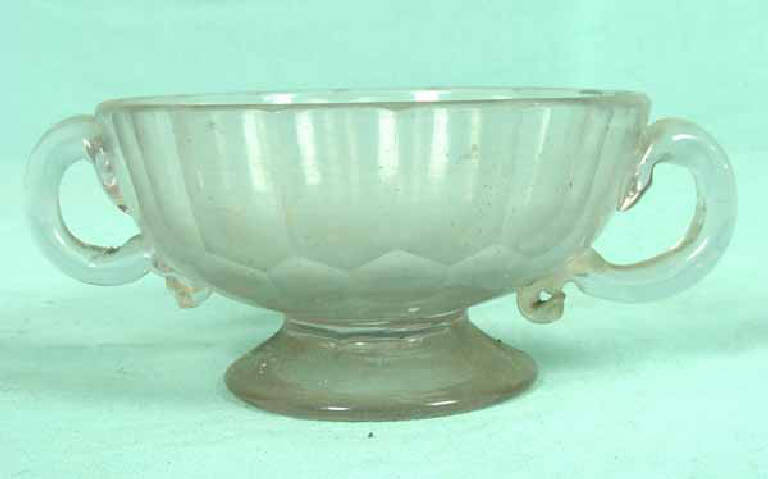 Coppetta con due anse in vetro pieno, decorata da molature con motivi ad esagono. Piede applicato di forma circolare. Segno del pontello