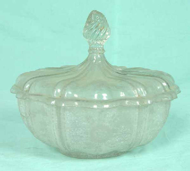 - NOTIZIE STORICO CRITICHE Appartiene probabilmente alla produzione veneziana "all'uso di Boemia". Talvolta è difficile distinguere questa produzione da quella boema, in quanto incisori boemi lavorarono nel XVIII secolo a Venezia (BAROVIER MENTASTI 1982, p.155; si veda scheda di catalogo n. 867).Una compostiera molto simile per il tipo di forma in vetro molto leggero con incisioni alla rotina a carattere naturalistico, differenti da quelle del nostro pezzo, è conservata nel Museo Vetrario di Murano (inv. cl.VI 1395). I motivi decorativi sono avvicinabili a quelli presenti su di un bicchiere del Museo Vetrario di Murano (Mille anni¿ 1982, p.202, n.357) e su un altro conservato nei Musei Civici di Piacenza, ambedue attribuiti a Venezia (BOJANI, MARIACHER 1985, p. 41, n. 45). Le incisioni a rotina molto leggere caratterizzano solitamente i soffiati prodotti a Venezia come quelle che decorano un calice con coperchio conservato nel Museo Vetrario di Murano (BAROVIER MENTASTI 1982, p.165, n.158).\nI caratteri della coppa e la sue incisioni permettono di attribuire il pezzo alla produzione settecentesca e a questo periodo è datata, sia una compostiera dello Spedale Serristori di Figline Valdarno, incisa alla mola, che presenta la medesima tipologia di presa a pomolo ritorto (LAGHI 1998, p.114).\nIl pezzo è citato nell'atto di donazione del 1937 al n.60: "coppa sagomata con coperchio e sottocoppa in vetro molato con decorazione a fiori sec. XVIII. Lire 250"