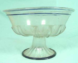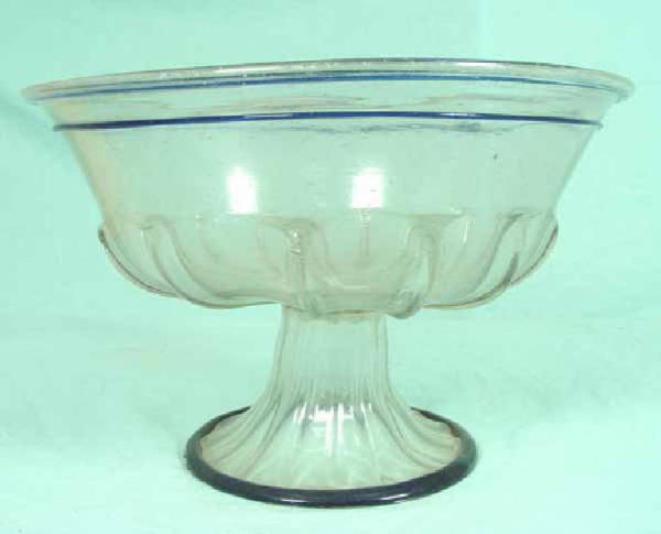 Coppa con dodici costolature verticali molto rilevate che coprono metà circa della superficie del corpo, ottenute con la tecnica a mezza stampaura; la parte superiore è decorata da due fili blu applicati a caldo. L'orlo della bocca è ripiegato esternamente su uno dei due fili blu. Il piede molto alto presenta diverse nervature ad andamento verticale. Filo vitreo blu applicato alla base del piede in un secondo momento. Segno del pontello
