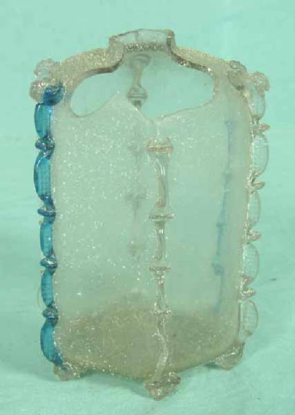 Bottiglietta di forma esagonale con base piana e fondo rientrante; decorata su i sei spigoli da quattro fili pinzati in vetro incolore e da altri due in vetro azzurro, tutti e sei a doppia pizzicatura, una in senso verticale e l'altra in senso orizzontale. I sei fili terminano formando i sei piedini, su i quali sono state applicate delle more a stampo e sui quali poggia la bottiglietta. Il collo perduto era molto probabilmente di forma cilindrica, svasato all'imboccatura. Segno del pontello