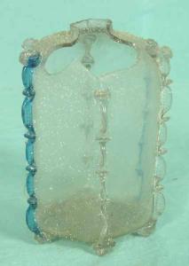 - NOTIZIE STORICO CRITICHE La produzione di questo tipo di bottigliette è ampiamente documentata nella produzione veneziana del Seicento e del Settecento. Furono realizzate in modo simile al nostro esemplare e molto spesso erano decorate a smalto con la figura di San Nicola, santo protettore dei maestri vetrai e dei naviganti. L'uso, al quale erano destinate queste bottiglie, era quello di raccogliere la "manna", cioè il liquido sgorgato dalle ossa del Santo, sprigionato dal suo sepolcro o dalle sue spoglie, come tramandava la tradizione popolare. Talvolta accanto alla figura del santo era rappresentato un veliero e un orante, come in un pezzo dei Civici Musei di Trieste (RUARO LOSERI 1975-1976, p.25, n.22; I vetri¿, n.25).\nLa datazione del nostro pezzo si basa, non tanto su questi esemplari dipinti, poiché lo stile di gusto popolare, non permette di dare delle indicazioni cronologiche precise, ma sul confronto con due soffiati, un vaso e una brocca in vetro azzurro, decorati con il motivo di fili vitrei a doppia pizzicatura, appartenenti alla collezione del Castello di Rosenborg a Copenaghen, formatasi nel primo decennio del Settecento (BOESEN 1960, nn.17-88). Lo stesso motivo decorativo lo si ritrova in tre brocche in vetro, raffigurate in alcune nature morte della fine del Seicento e degli inizi del Settecento: Loggia con giardino, fiori, frutta e donna dell'amburghese italianizzato Christian Berentz, datata 1696 (BAROVIER MENTASTI 1982, p.123, fig.111) e in due opere di Cristoforo Munari, Violoncello con arco, alzata con cristalli, libri (1708) e Alzata con cristalli, foglio con notazioni musicali, datata 1710 (BALDASSARI, BENATI 1999, pp. 88-89, n. 21, pp.110-111, n.33).\nI pezzi più simili al nostro sono conservati nel Museo Bagatti Valsecchi di Milano (BAROVIER MENTASTI, TONINI 2003, pp.420-421, n.505) e nel Museo Vetrario di Murano (DORIGATO 2002, p.111).