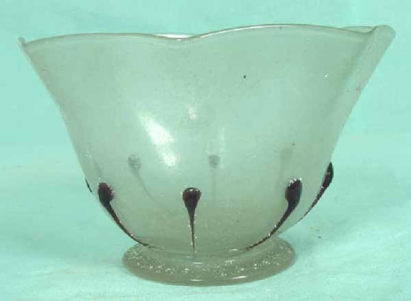 Piccola coppetta con orlo ottagonale e goccioloni in vetro viola applicati nella parte inferiore Base circolare applicata successivamente. Si tratta probabilmente di una coppetta lavadita