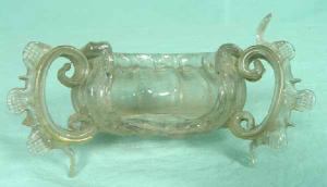 - NOTIZIE STORICO CRITICHE Il nostro pezzo era forse un'acquasantiera e può essere ascritto alla produzione alla façon de Venise per le sue caratteristiche stilistiche, per la qualità giallastra del vetro con cui sono realizzate le ansette e per alcuni confronti con alcuni soffiati simili. Il motivo delle ansette crestate compare sui soffiati veneziani della fine del Seicento e degli inizi del Settecento, come documentato da alcuni pezzi del Castello di Rosenborg a Copenaghen, datati tra il 1708 e il 1709 (BOESEN 1960, n.19) e da alcune fonti figurative del medesimo periodo (La natura morta 1989, vol.II, n.827), ma queste si differenziano da quelle del nostro pezzo per la maggiore raffinatezza esecutiva. La nostra acquasantiera è avvicinabile ad un pezzo simile conservato nel Kunstgewerbemuseum di Berlino, caratterizzato anch'esso da evidenti costolature verticali sul corpo e dal motivo a creste che decora gli attacchi dei due anelli, nei quali è inserita una catenella in vetro, utilizzata per appenderlo. Questo pezzo, attribuito à la façon de Venise e in modo dubitativo al Sud dell'Olanda, è stato datato alla seconda metà del XVII secolo (DREIER 1989, p.139, n.156).
