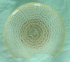 Sottocoppa decorata con fili di lattimo disposti a festoni, leggermente a rilievo. Filo vitreo giallo applicato sull'orlo esterno della coppa. Piede a tromba con bordo ripiegato al di sotto del piede. Segno del pontello