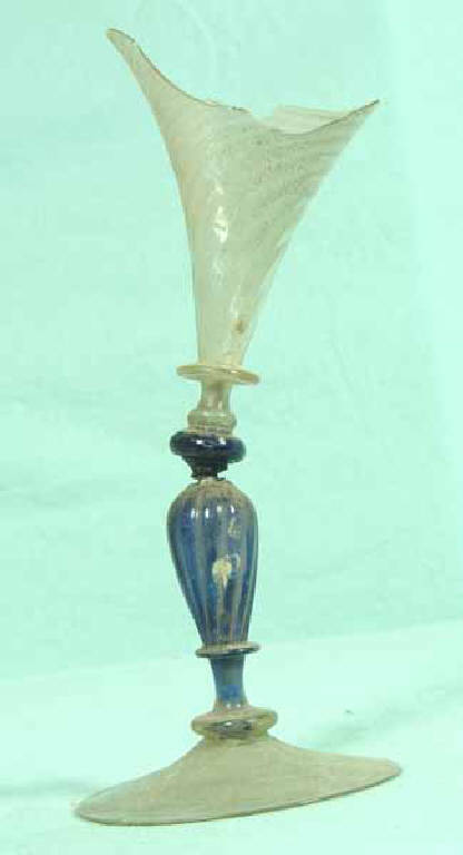 - NOTIZIE STORICO CRITICHE Il nostro pezzo appartiene alla produzione muranese della fine del Cinquecento e degli inizi del Seicento, poiché è caratterizzato da armoniche proporzioni che connotano i calici di questo periodo: lo stelo "archittetonico, il piede di ridotte dimensioni (BAROVIER MENTASTI 1995, p.886). \nIl motivo dello nodo in vetro blu o azzurro compare in alcuni calici, databili tra la fine del Cinquecento e gli inizi del Seicento, come in due pezzi, uno integro e l'altro frammentario, conservati nei Musei Civici di Pavia (DIANI, TONINI 2004, p.56, n.31; p.135, n.139). Lo stelo in vetro blu caratterizza due calici per i quali sono state proposte cronologie diverse: un esemplare è nelle Kunstsammlungen der Veste Coburg, datato tra la fine del Cinquecento e la prima metà del Seicento (THEUERKAUFF LIEDERWALD 1994, p.287, n.270) e l'altro, datato in passato al XVI secolo, è conservato nel Museo Vetrario di Murano (MARIACHER 1963, p.47)