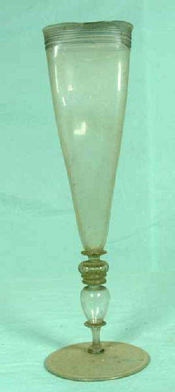 - NOTIZIE STORICO CRITICHE Sulla diffusione, la produzione dei calici a flute in ambito muranese e nelle vetrerie d'Oltralpe che lavoravano alla façon de Venise e la loro raffigurazione nella coeva produzione figurativa si rimanda alla scheda di catalogo n.862.\nI confronti più stringenti sono con due esemplari, corredati da uno stelo diverso e dalla coppa molto simile, anche se non è decorata da fili avvolti come nel nostro caso, conservati: uno nel Museo Civico di Torino (MALLÉ 1971, p.46, fig.21) e l'altro nel Museo Calderini di Varallo, facente parte di un gruppo di soffiati appartenenti al corredo di una delle cappelle del Sacro Monte di Varallo (PETTENATI 1996, p.414, n.16).