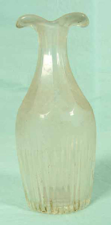 Bottiglia di forma con imboccatura svasata e aperta a corolla perduto il tappo . Incisioni, sulla parte inferiore del corpo, spesse alla mola, fitte e ad andamento verticale che formano un motivo ad arco nella parte superiore. Ampie molature circolari sul collo terminanti a punta