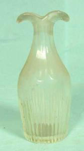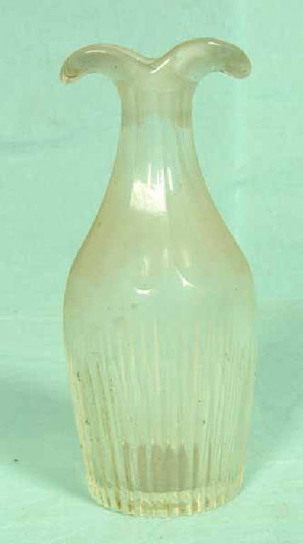 Bottiglia di forma con imboccatura svasata e aperta a corolla, con tappo.Spesse incisioni alla mola, sulla parte inferiore del corpo, ad andamento verticale terminanti con un arco nella parte superiore. Ampie molature sul collo terminanti a punta
