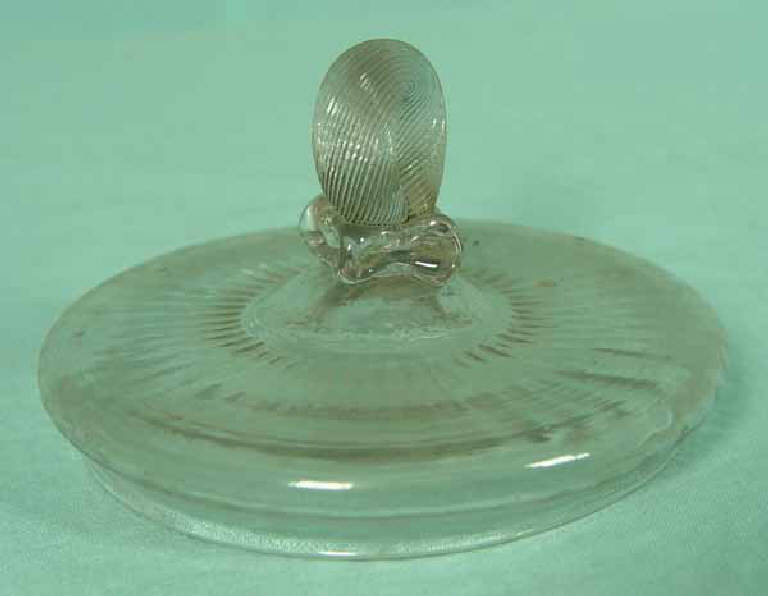 - NOTIZIE STORICO CRITICHE XVII- XVIII sec.Nella letteratura consultata non è stato ritrovato un esemplare simile al nostro. L'unico confronto possibile è con un flacone con tappo a vite coronato da un anello che presenta la medesima lavorazione della presa del nostro pezzo, conservato nel Kunstgewerbemuseum di Berlino, che è stato datato tra XVII- XVIII secolo (DREIER 1989, p.106, n.106). Il tipo di lavorazione della presa la si ritrova anche in due calici del XVII secolo, di area veneziana, conservati nel British Museum di Londra, che presentano nello stelo il motivo di un filo vitreo spesso ritorto, simile nella lavorazione alla presa del nostro coperchio (TAIT 1979, n.142 e n.147) ed in un altro calice con stelo aforma di dragone del Corning Museum of Glass (BAROVIER MENTASTI 1982, p.132, n.123).
