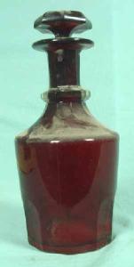 Bottiglia vetro rosso incamiciata nel vetro incolore, a base poligonale con undici lati e con molature a forma di arco nella parte inferiore. Collo di forma cilindrica con un anello applicato a dieci lati, molato. Imboccatura svasata e molata. Tappo ottagonale incamiciato nel vetro cristallo