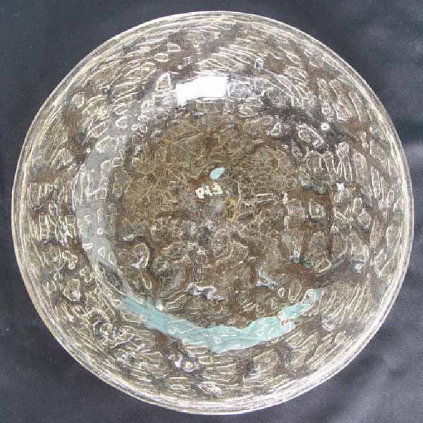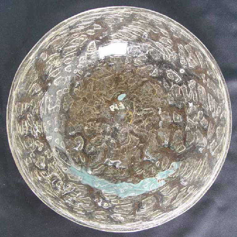 Piatto di forma circolare, leggermente fondo. La lavorazione a ghiaccio risulta nella parte esterna del piatto, forse schegge di vetro applicate. Orlo della tesa ripiegato esternamente. Segno del pontello.