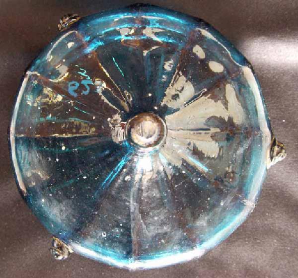 Coperchio in vetro blu percorso da dodici costolature verticali. Tre more mal eseguite, con tracce di doratura. Presa frammentaria formata da un elemento cilindrico sormontato da due dischi. Segno del pontello.